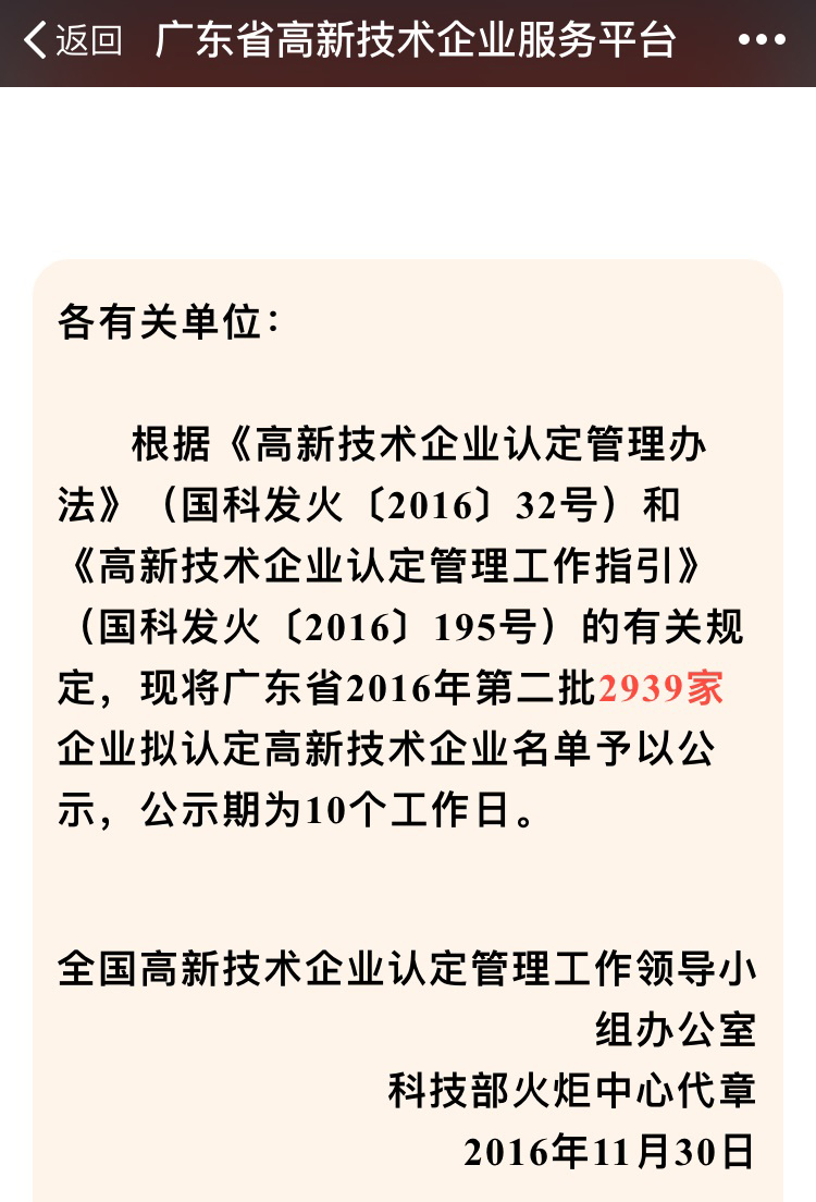 11月30日,全國高新技術企業認定管理工作領導小組辦公室公布了2016年廣東省第二批擬認定國家高新技術企業名單,共2939家企業通過國家高新技術企業認定。科園榜上有名,榮獲國家高新技術企業,這是對我司的高度認可,更堅定了我們自主研發、自主創新,堅持中國創造的產業決心!