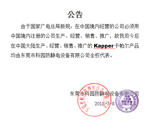 由于國家廣電總局新規(guī):在中國境內(nèi)經(jīng)營的公司必須用中國境內(nèi)注冊的公司生產(chǎn)、經(jīng)營、銷售、推廣,故我司今后在中國大陸生產(chǎn)、經(jīng)營、銷售、推廣的Kapper卡帕爾產(chǎn)品均由東莞市科園防靜電設備有限公司全權代表