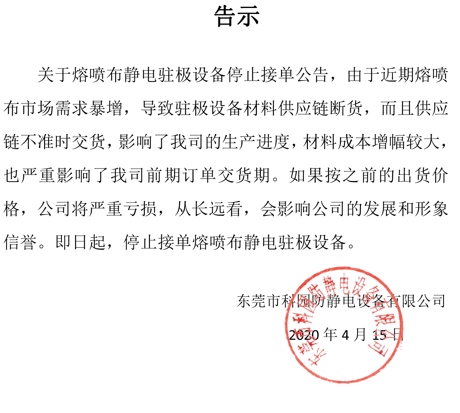 關(guān)于熔噴布靜電駐極設(shè)備停止接單公告,由于近期熔噴布市場(chǎng)需求暴增,導(dǎo)致駐極設(shè)備材料供應(yīng)鏈斷貨,而且供應(yīng)鏈不準(zhǔn)時(shí)交貨,影響了我司的生產(chǎn)進(jìn)度...