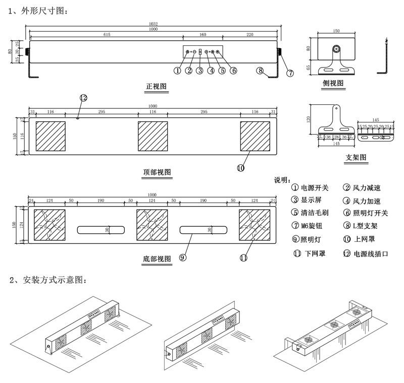 KP103A第5代智能型懸掛式三頭離子風機由小風機提供風力,風力大小可在觸摸按鍵或遙控器中進行調(diào)節(jié),發(fā)射針毛刷具有自動清潔功能,每隔8個小時自動記憶自動清潔,免手工清潔,并可訂做自行設置清潔時間,具備高壓故障風鳴報警及報警燈提示功能,聽覺,視覺雙重直觀了解設備是否正常工作,風扇在正常運作過程中遇到障礙物,風機會自動短路停止工作。