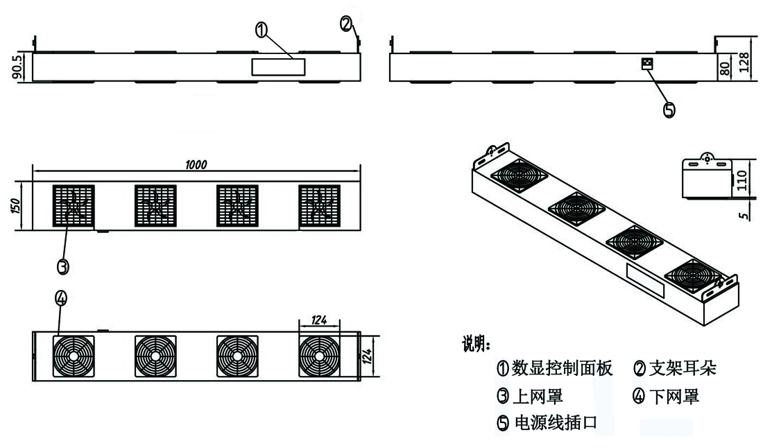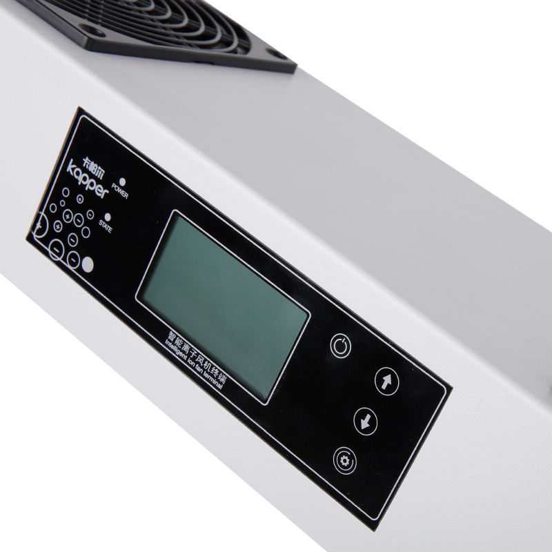 KP104C第六代智能型懸掛式四頭離子風機由小風機提供風力,風力大小可在觸摸按鍵或遙控器中進行調節。
